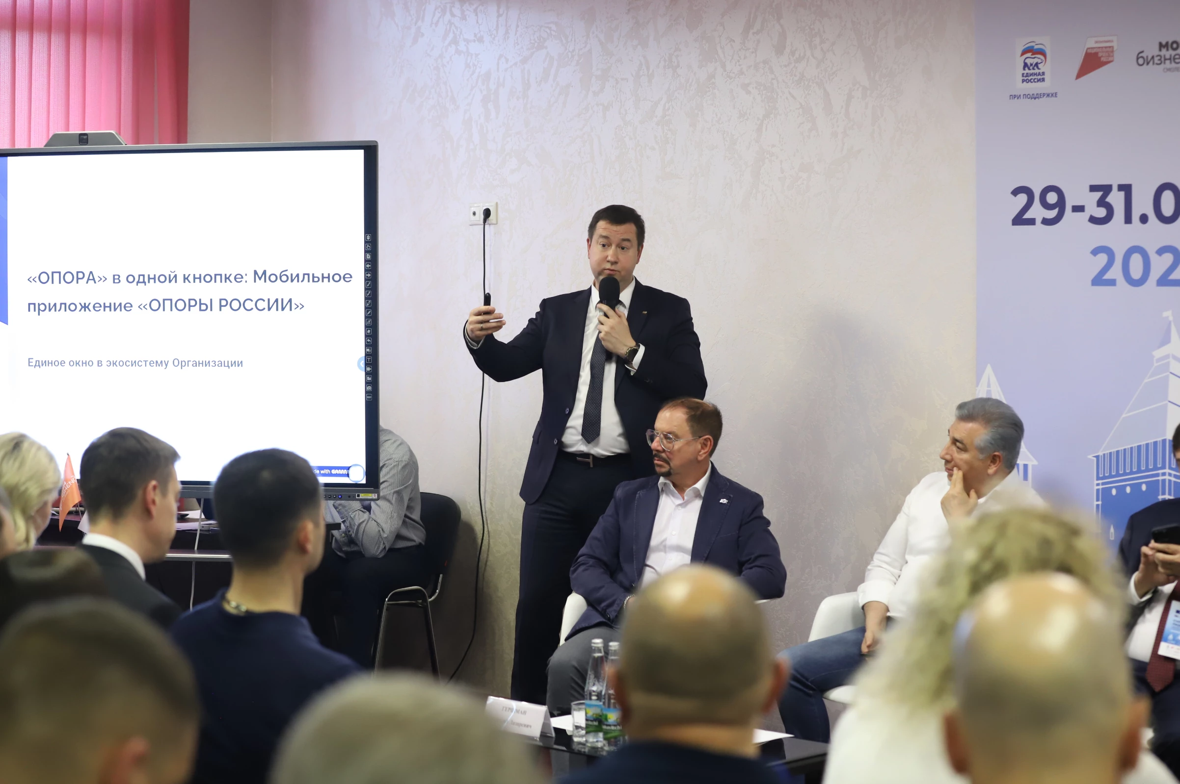 Исполнительный директор «ОПОРЫ РОССИИ» Андрей Шубин рассказал участникам о статусе внедрения тестовой версии и сервисах, которыми будет наполняться приложение.