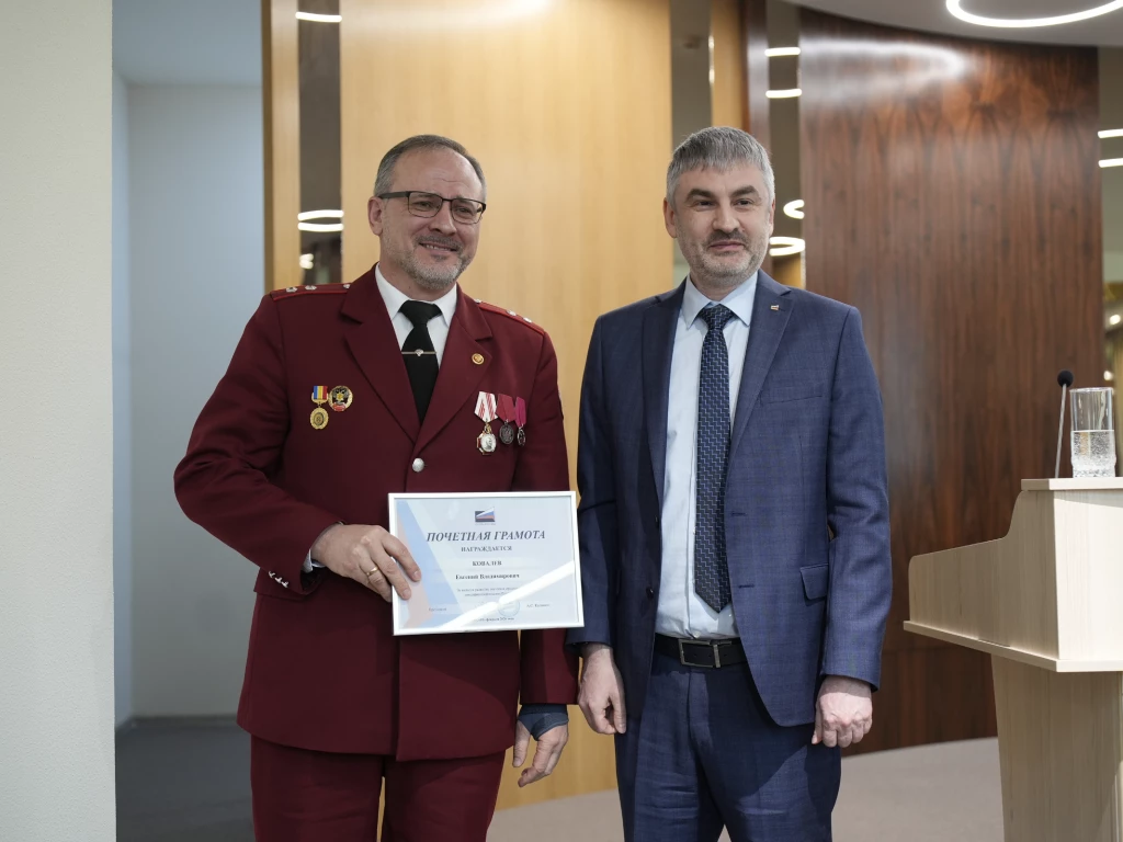 13 февраля в Ростове-на-Дону состоялось расширенное заседание коллегии Управления Роспотребнадзора по Ростовской области, посвященное подведению итогов деятельности ведомства за 2025 год и определению задач на 2026 год. В рамках мероприятия Председатель Ростовской «ОПОРЫ РОССИИ» Вадим Мирошниченко вручил руководителю ведомства Евгению Ковалеву Почетную грамоту «ОПОРЫ РОССИИ» за конструктивное взаимодействие с предпринимательским сообществом и вклад в развитие деловой среды региона.