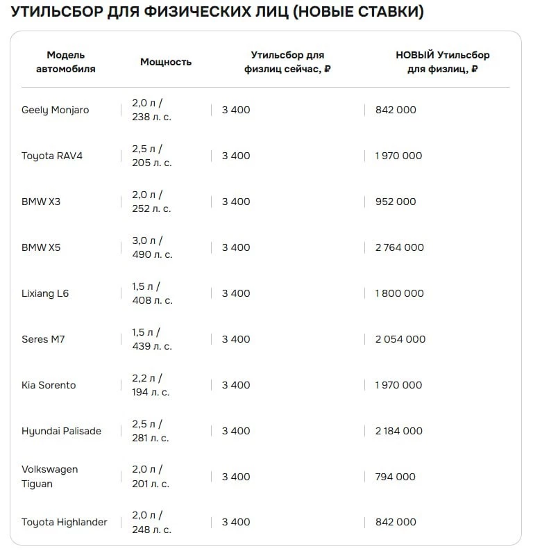 В качестве примера эксперт привел таблицы изменения стоимости утилизационного сбора для популярных автомобилей, ввозимых на территорию физическими и юридическими лицами.