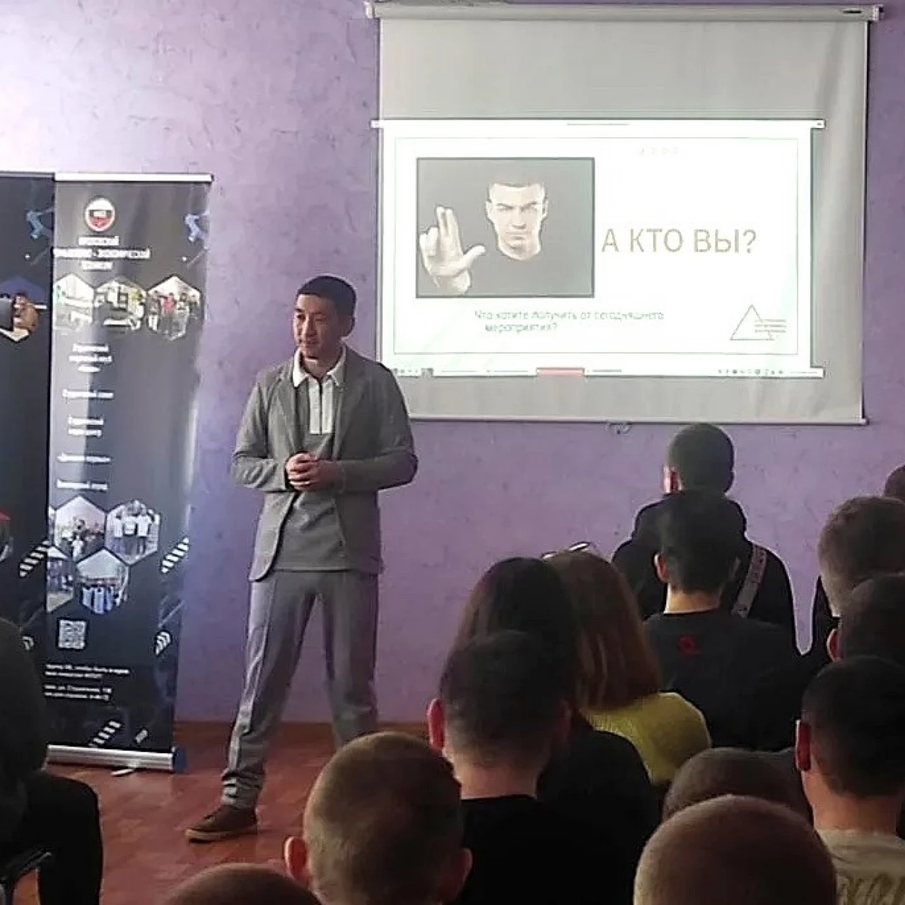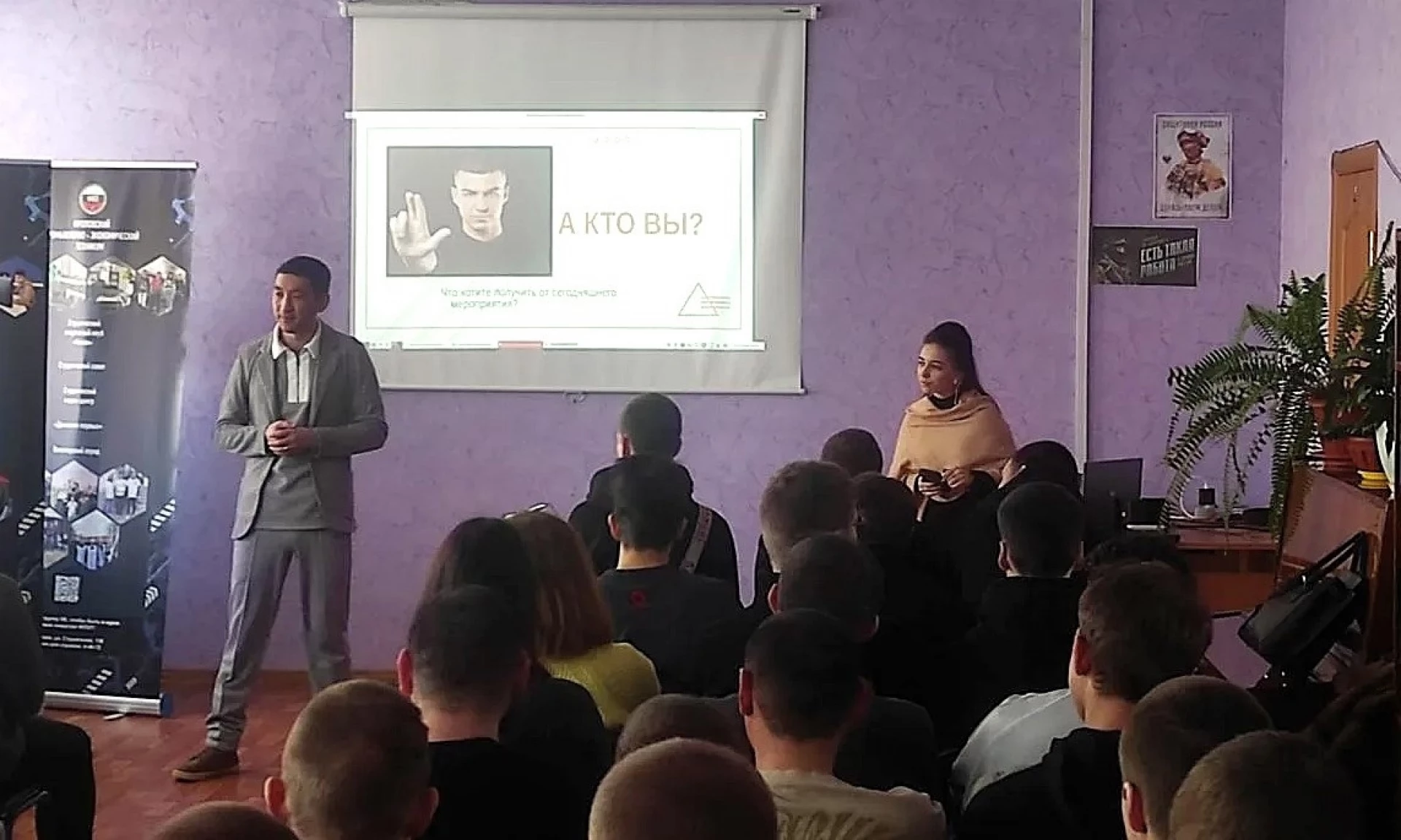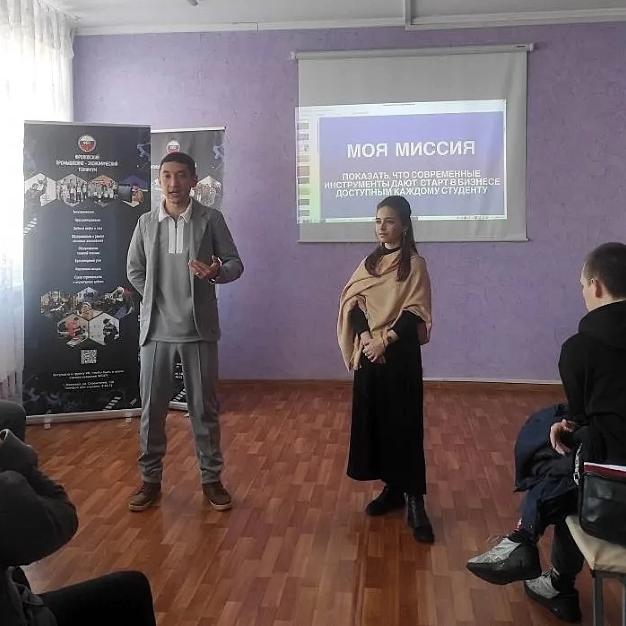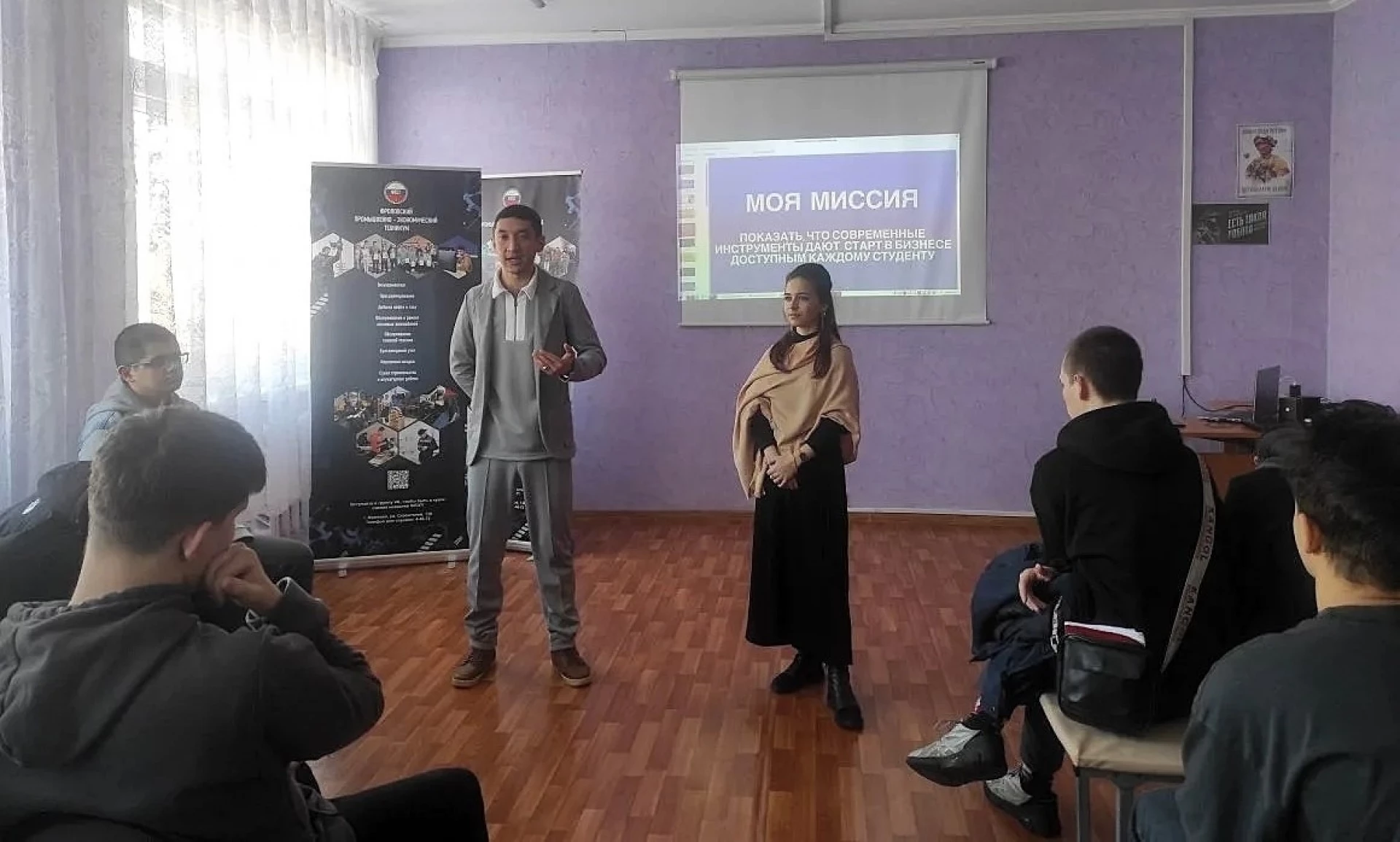 Первая часть визита была полностью посвящена молодежи. Мастер-класс для студентов провели Председатель Комитета по развитию молодежного предпринимательства Волгоградской «ОПОРЫ РОССИИ» Болат Мурзагалиев и заместитель Председателя Комитета, окружной представитель по ЮФО сообщества «Росмолодежь.Предпринимай» по развитию молодежного предпринимательства Татьяна Прошина.
