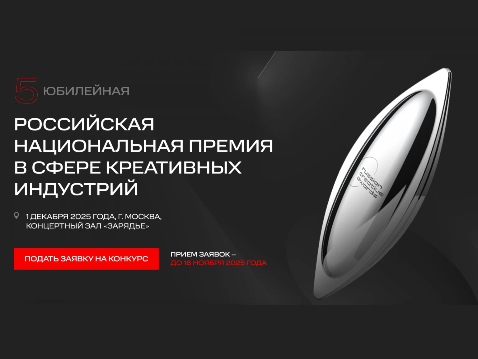 Продолжается прием заявок на V Российскую Национальную премию в сфере креативных индустрий. Проекты принимаются по 11 номинациям до 16 ноября. К участию приглашаются предприниматели, организации, объединения, представляющие креативные индустрии, либо реализующие кросс-индустриальные проекты. Организатор премии — АНО «Креативная экономика» при поддержке Администрации Президента Российской Федерации.