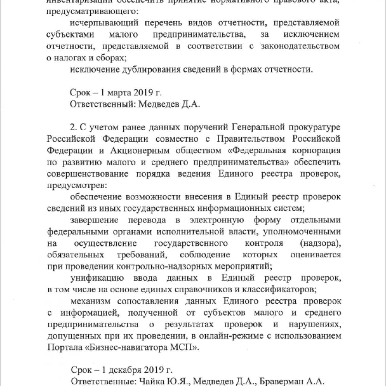 Также глава государства поручил Генеральной прокуратуре, Правительству РФ и Корпорации МСП в срок до 1 декабря 2019 года усовершенствовать порядок ведения Единого реестра проверок, предусмотрев внесение в Единый реестр сведений из других государственных информационных систем, завершив перевод в электронную форму обязательных требований, которые оцениваются при проведении проверок. Среди других поручений в этой части оказалась унификация ввода данных в Единый реестр и создание механизма сопоставления данных реестра с информацией, полученной от субъектов МСП о результатах проверок и выявленных нарушениях в онлайн-режиме с использованием портала «Бизнес-навигатор МСП».