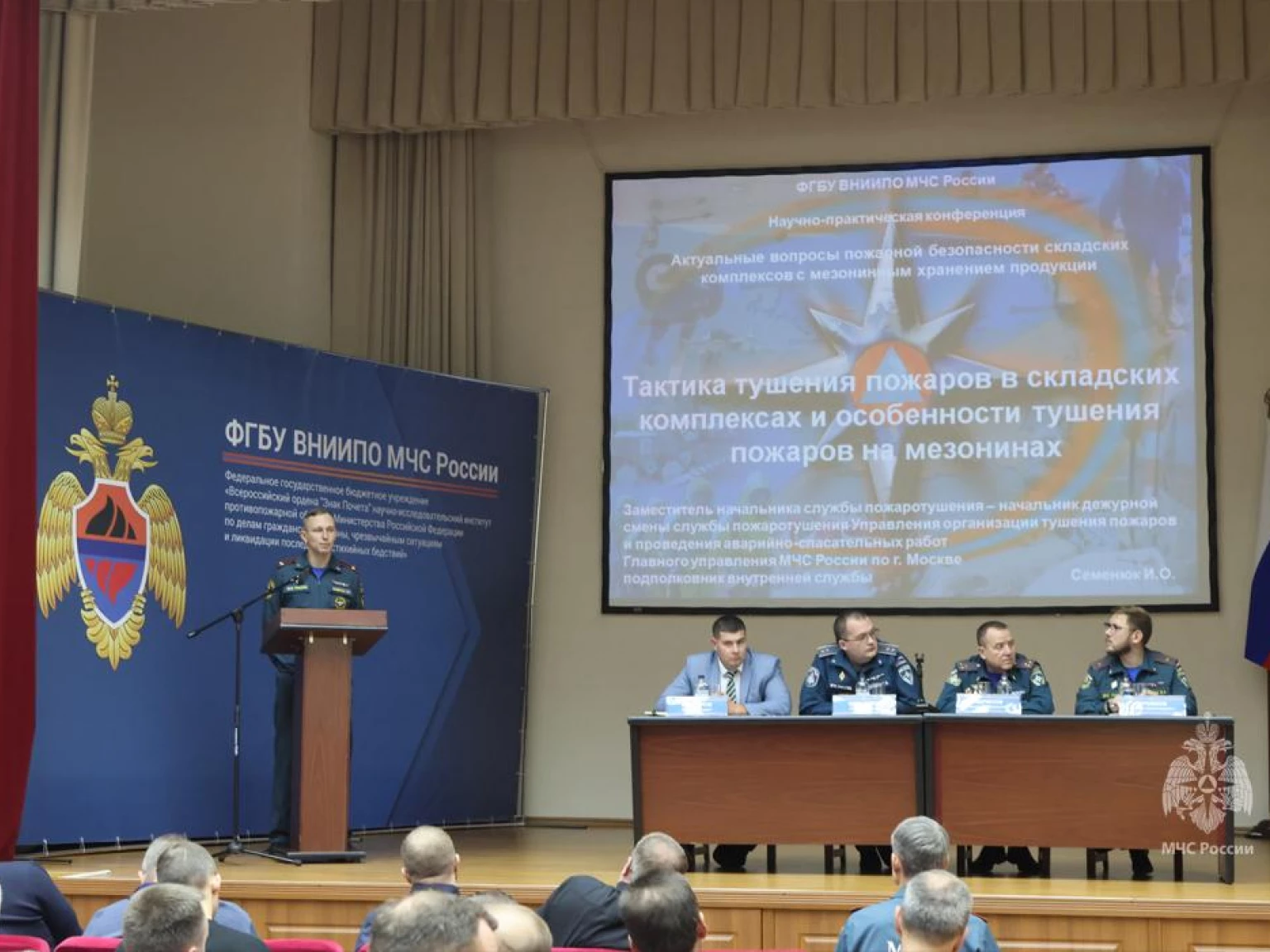 На прошедшей конференции ВНИИПО представил первую редакцию проекта Свода правил «Здания складов с мезонинами. Требования пожарной безопасности». В документе освещена практика тушения складов с мезонинами, особенности исследования пожаров на мезонинах, новые данные по частотам пожаров на складах, а также результаты натурных экспериментов по тушению пожаров на мезонинах, организованных в 2022–2025 гг.