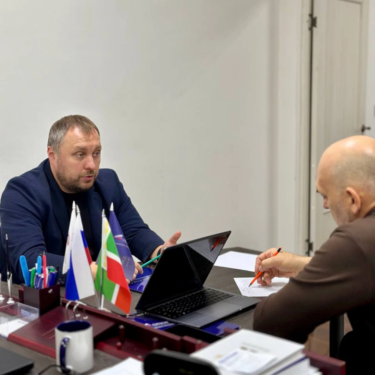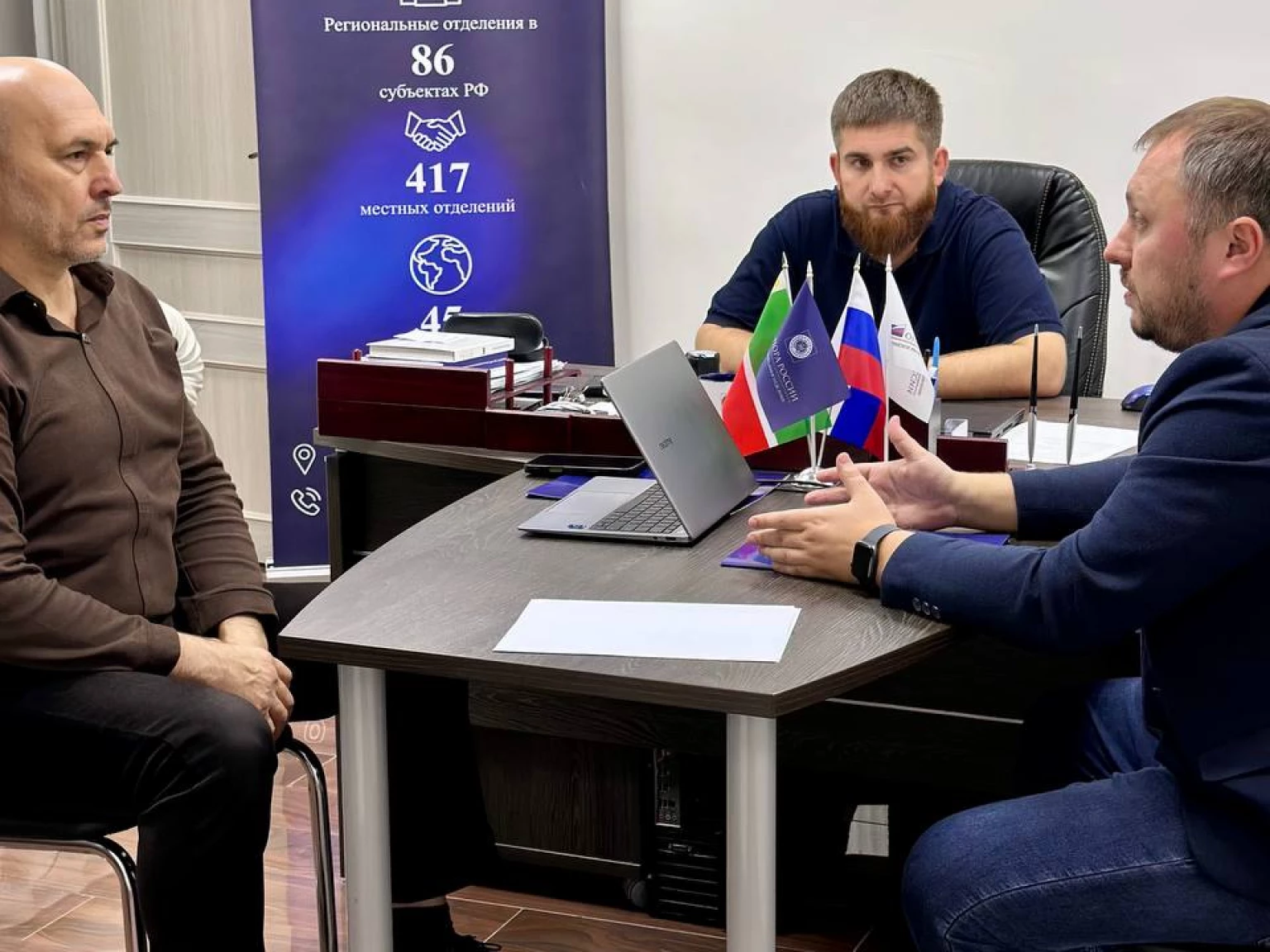 В офисе Чеченского регионального отделения «ОПОРЫ РОССИИ» состоялась встреча Исполнительного директора Расула Цамаева, Председателя Комиссии по правовым вопросам Отделения Сайдаша Гагаева с территориальным менеджером по работе с партнерами ПАО «Сбербанк» Максимом Бабыниным.
