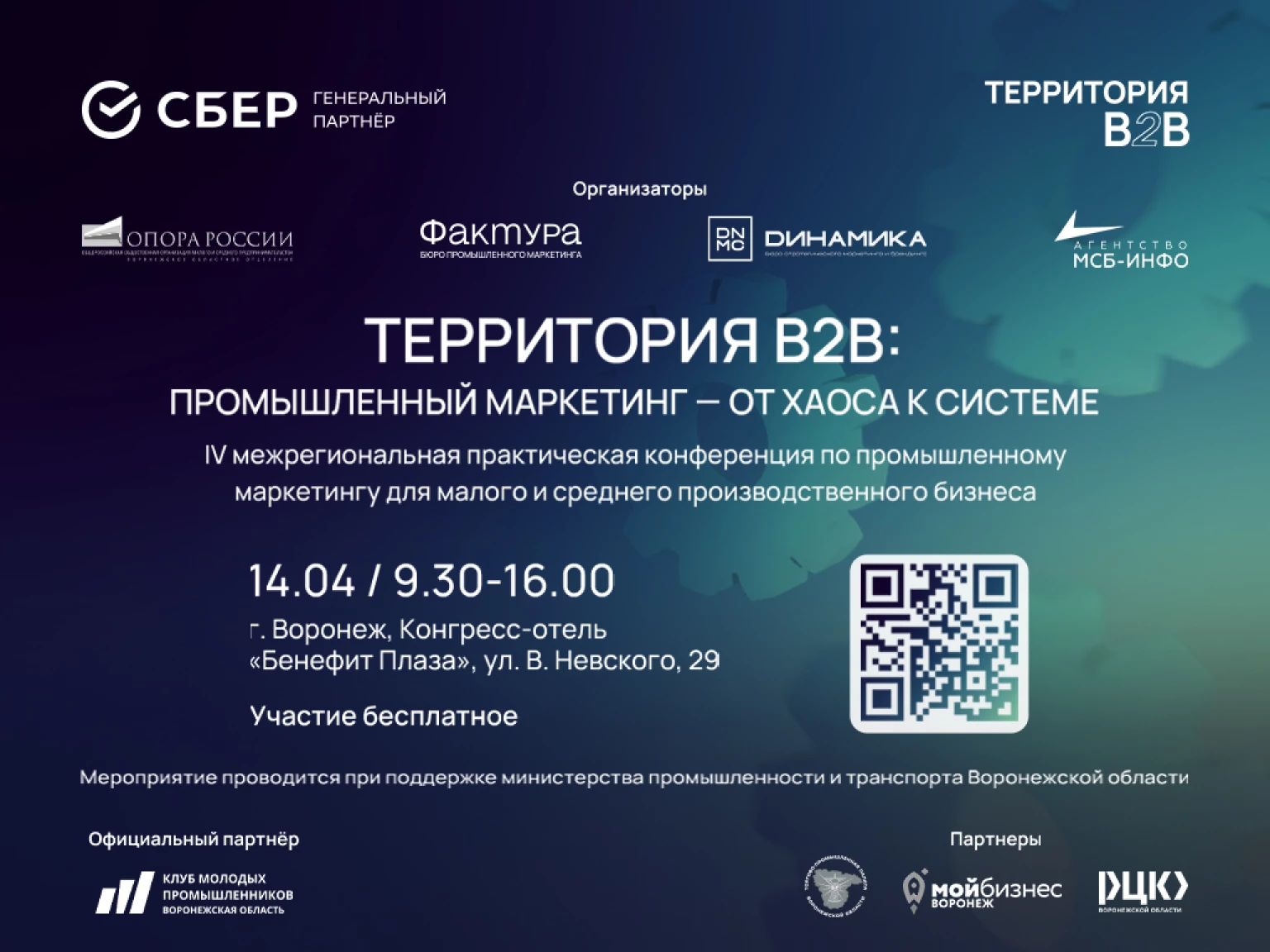 14 апреля в Воронеже пройдет IV межрегиональная конференция «Территория B2B», которая соберет собственников и топ-менеджеров производственных предприятий из разных регионов России. Мероприятие, организованное по инициативе членов Воронежской «ОПОРЫ РОССИИ», станет площадкой для обсуждения стратегических и профессиональных вопросов, знакомства с актуальной повесткой и мерами поддержки, изучения опыта коллег и расширения деловых связей.